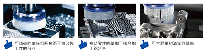 大面積或複雜工件的去毛邊工具,可用於CNC 機台或機械手臂。特別適合於加工過程完成後,透過快速且可靠地自動化加工過程後使用。主要應用是在不改變工件幾何形狀的情況下,對精密零件進行精密去毛邊、倒圓角及表面精加工。特點: